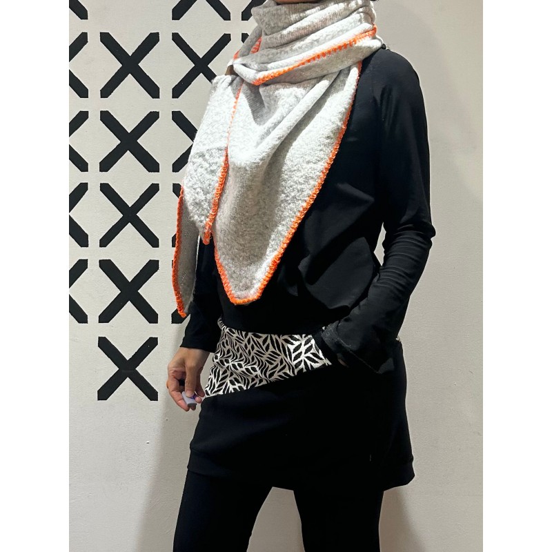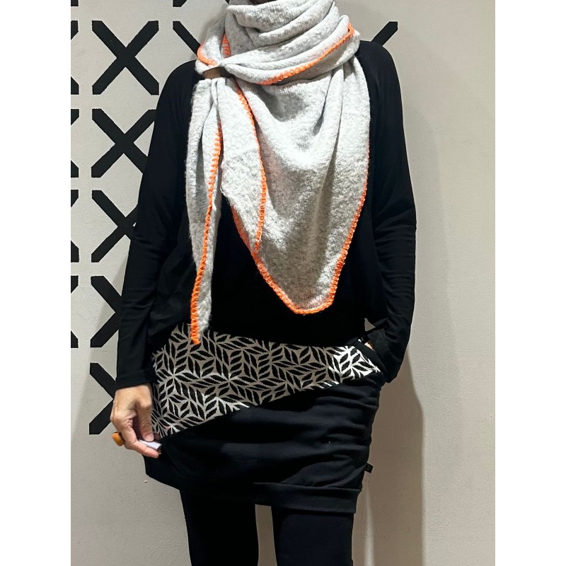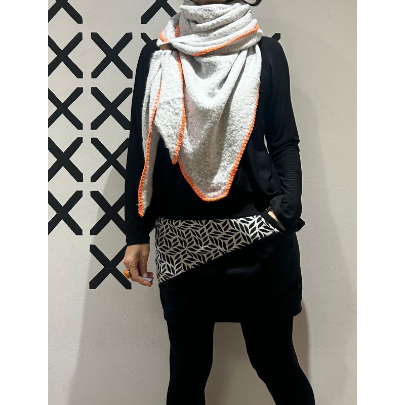 Cuello bufanda en forma triangular (con detalle en piel para atar)  prespunte a contraste.