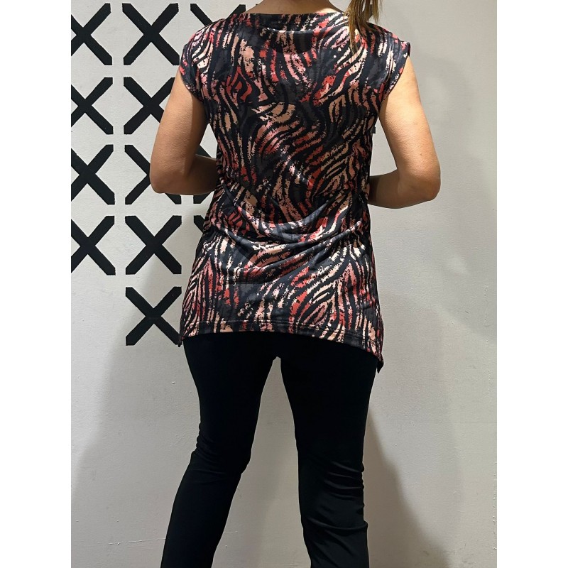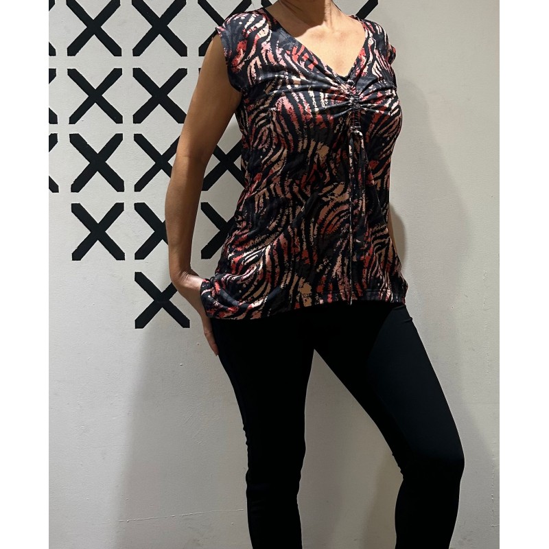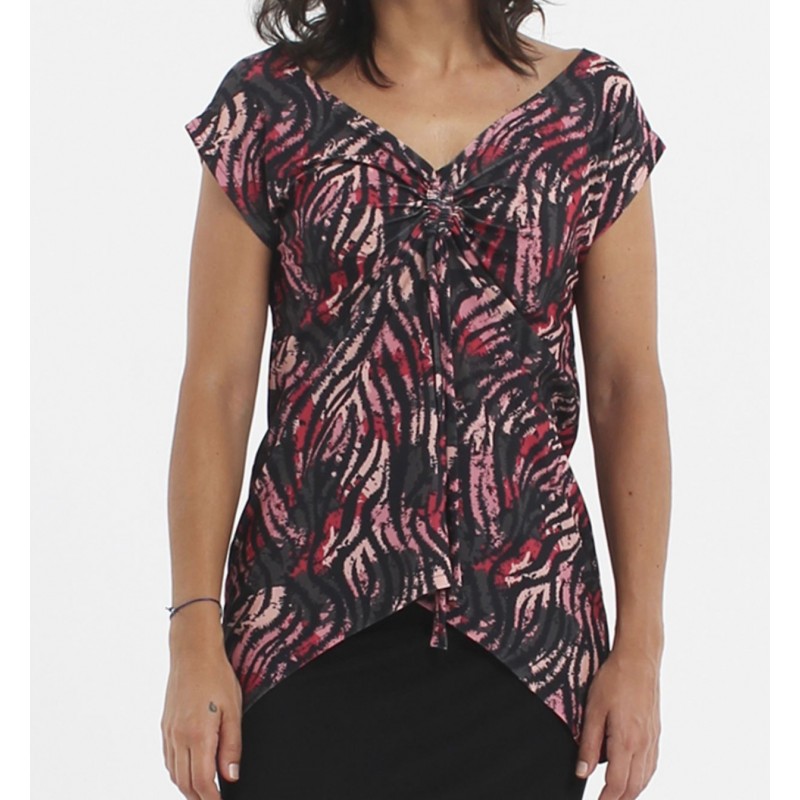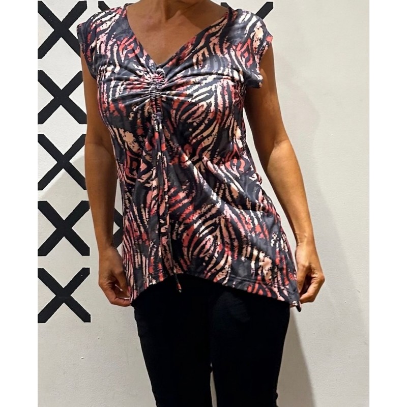 Top con fruncido central ajustable con lazada, que genera un ligero drapeado en la parte delantera y aporta movimiento a la prenda y su bajo con forma curva y dos originales picos laterales.
