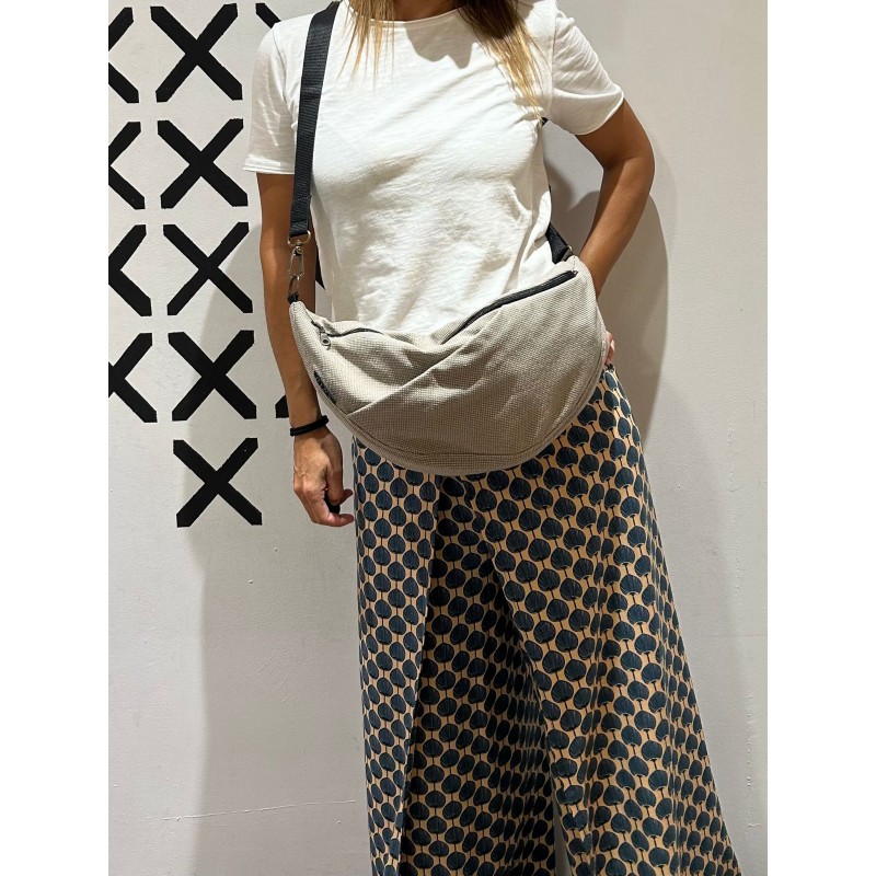 Tiene un bolsillo interior con cremallera y en el exterior, otro bolsillo en diagonal con cremallera escondida, para llevar lo que necesitas más a mano.