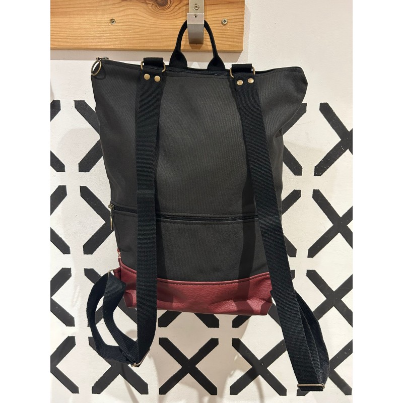 Mochila artesanal en negro, estampado multicolor y base en grana polipiel.