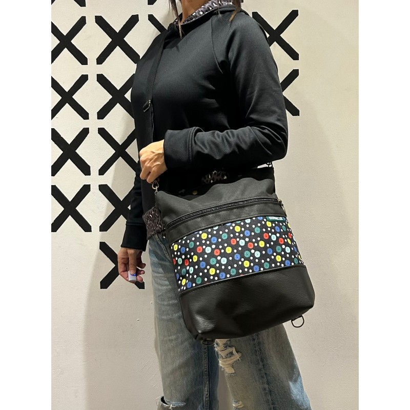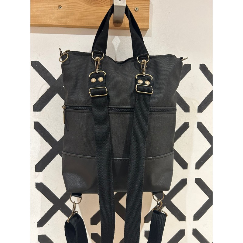 Bolso o Mochila artesanal de lona negra con tejido estampado y base de polipiel.