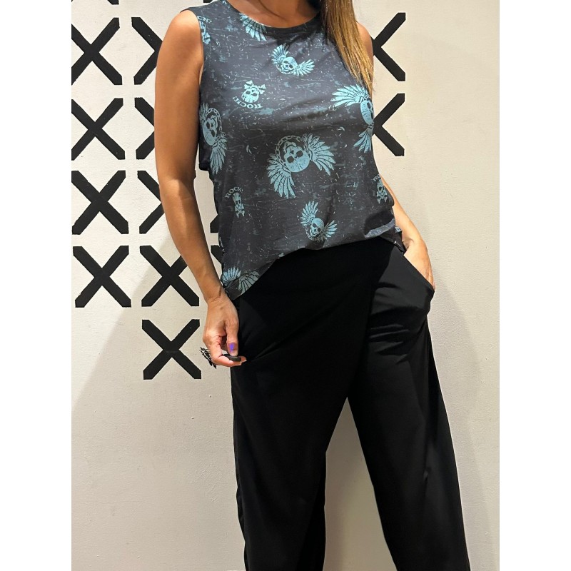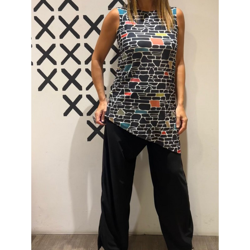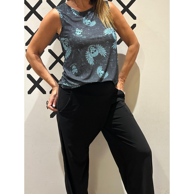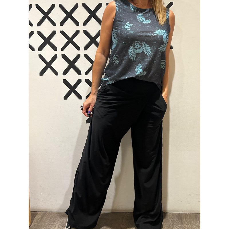 Corte fluido con pieza cruzada delante, un toque diferente para este pantalón que estiliza la figura aportando movimiento y comodidad. la cinturilla es elástica y ancha del mismo tejido del pantalón y no lleva ningun tipo de cierre.