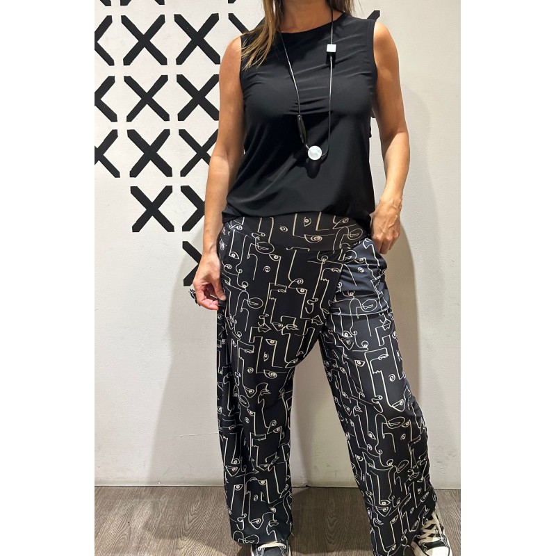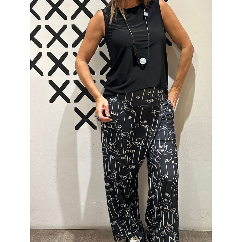 Corte fluido con pieza cruzada delante, un toque diferente para este pantalón que estiliza la figura aportando movimiento y comodidad. la cinturilla es elástica y ancha del mismo tejido del pantalón y no lleva ningun tipo de cierre.
