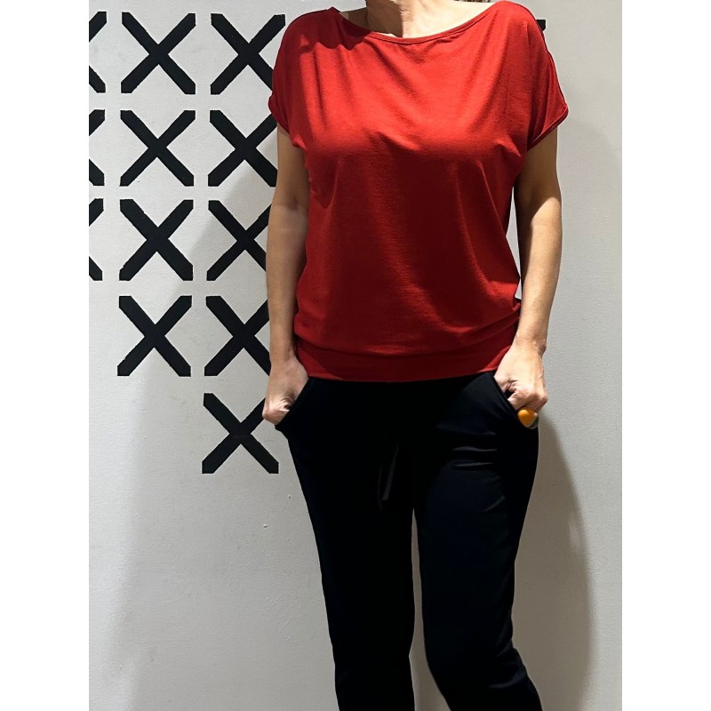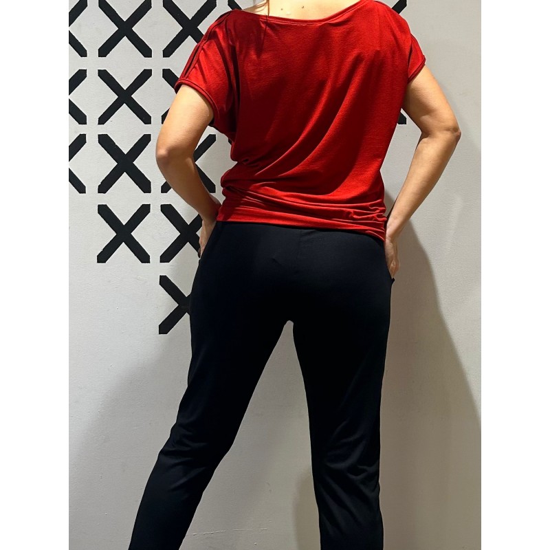 Camiseta cuello barca en viscosa elástica con cinta elástica en la cintura y aperturas en las manguitas.