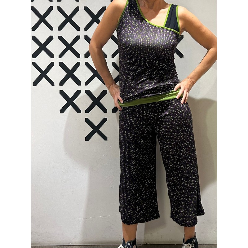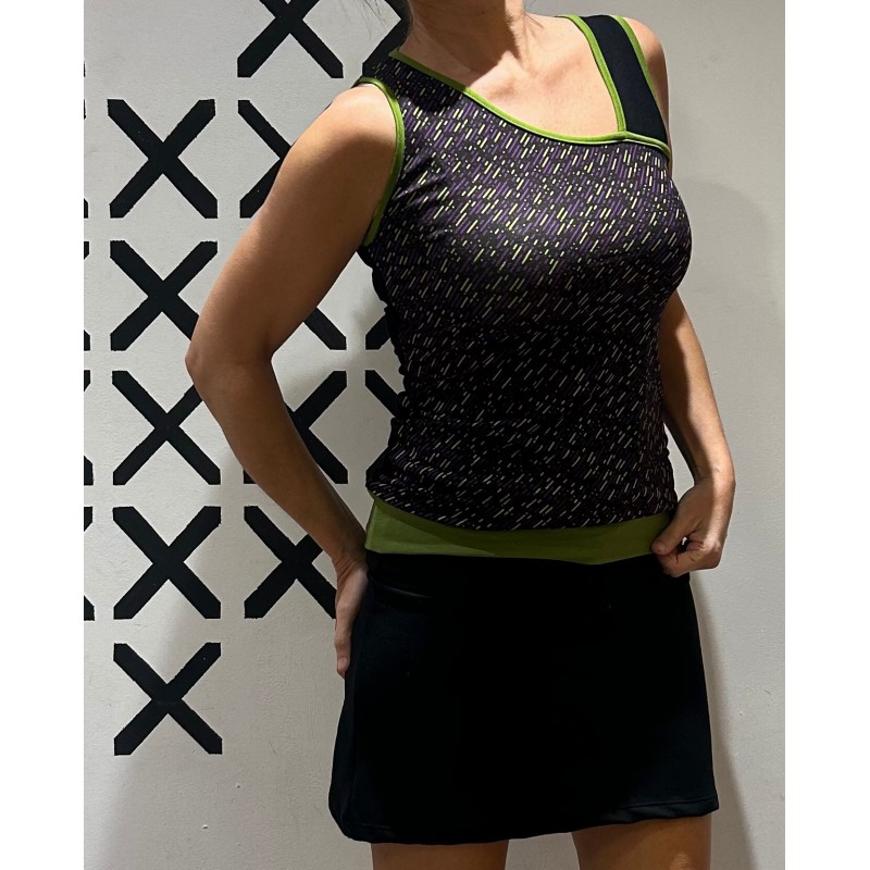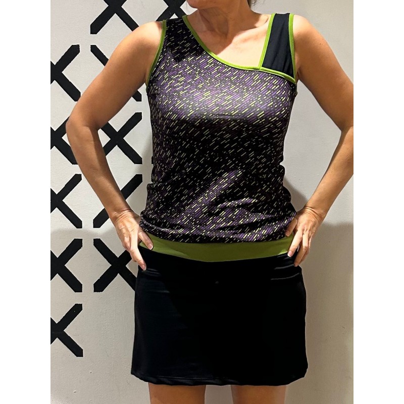 Camiseta tirantes asimétricos. EStampado en fondo lila palitos ribete verde.