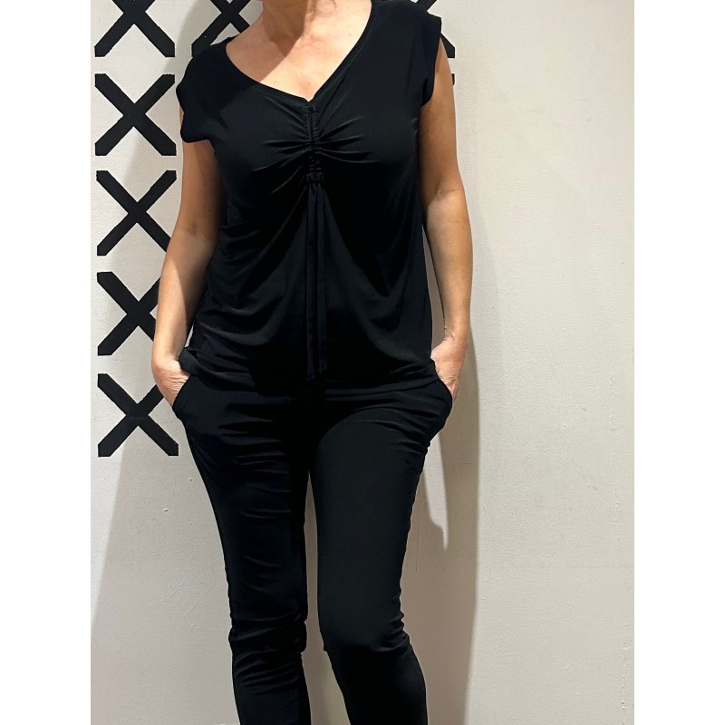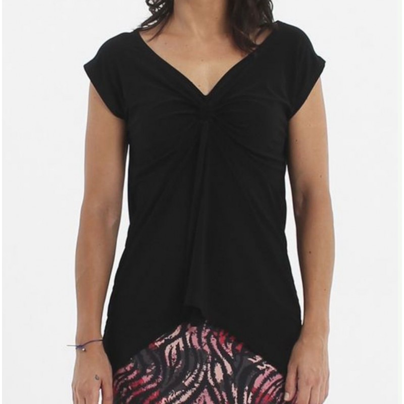 Top con fruncido central ajustable con lazada, que genera un ligero drapeado en la parte delantera y aporta movimiento a la prenda y su bajo con forma curva y dos originales picos laterales.