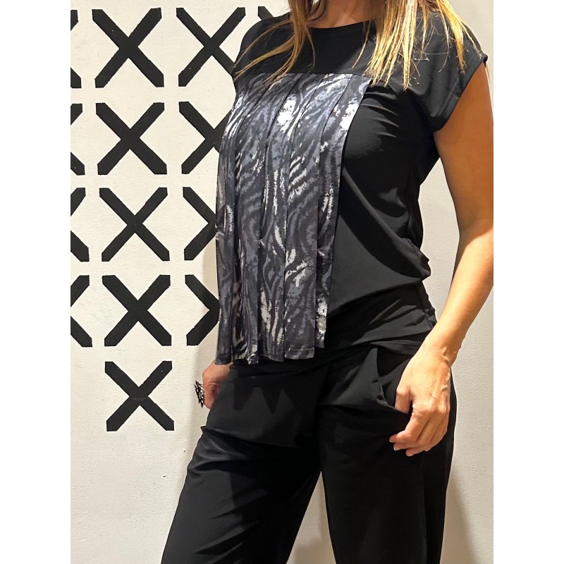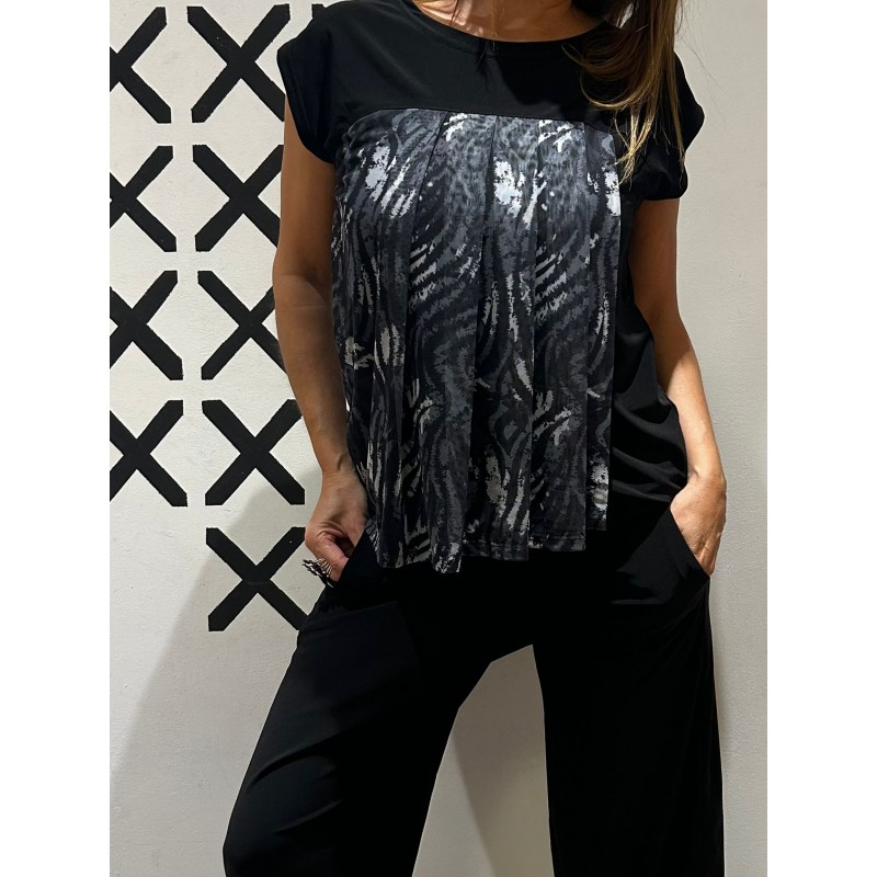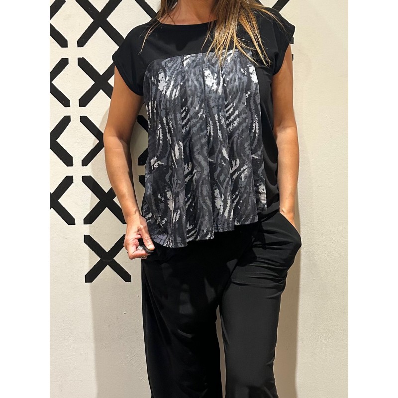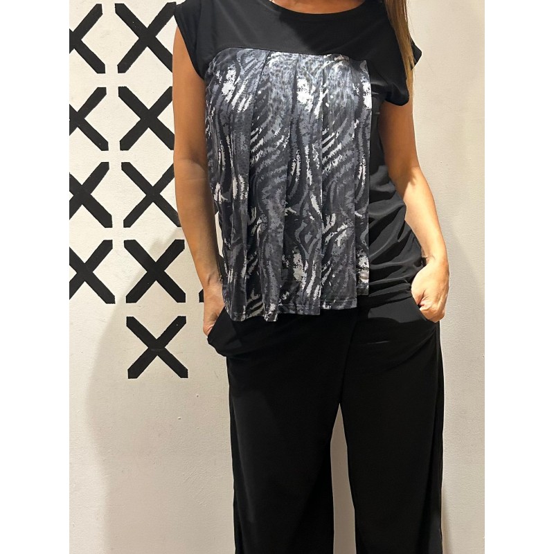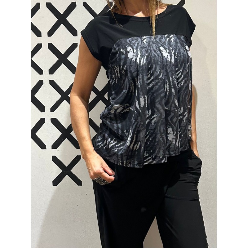 Está confeccionado con dos tipos de tejido: una base lisa que aporta estructura y comodidad, y un panel delantero en tul estampado que crea un efecto ligero y con personalidad.