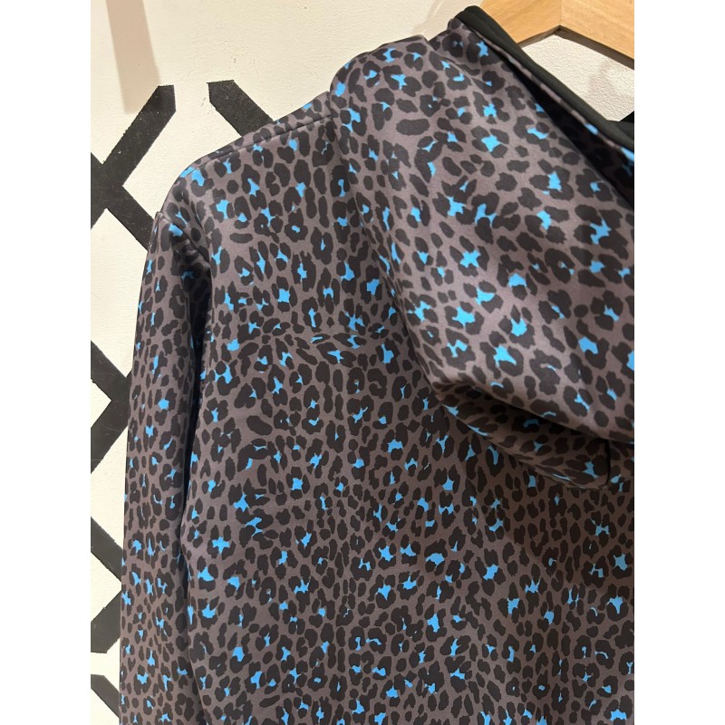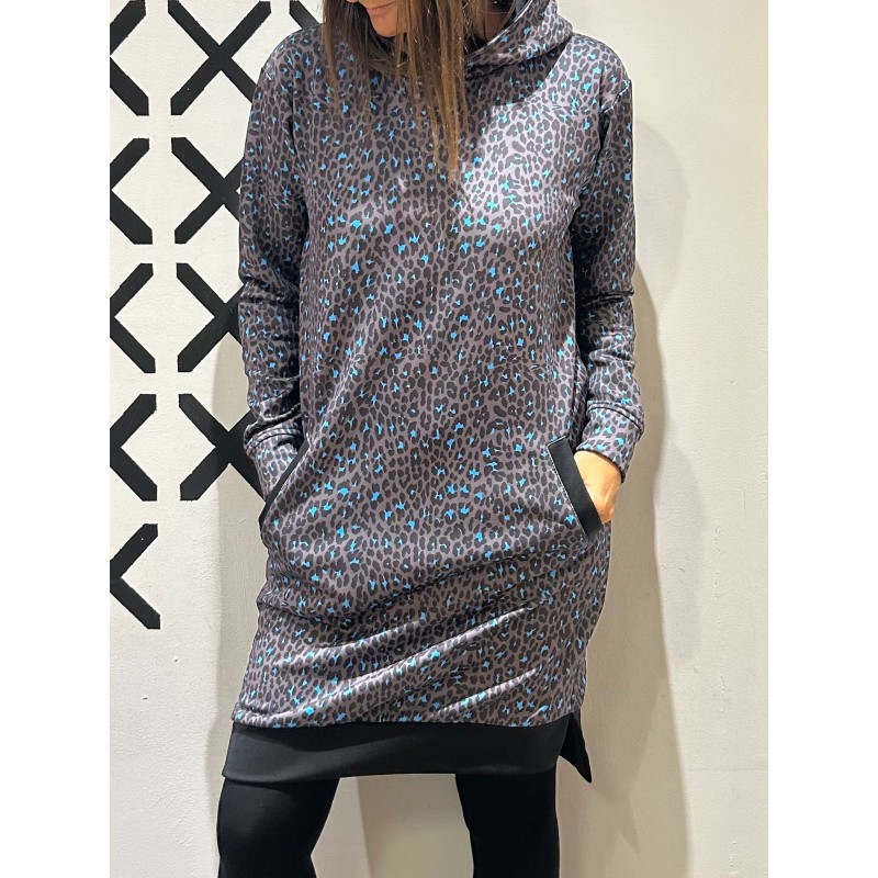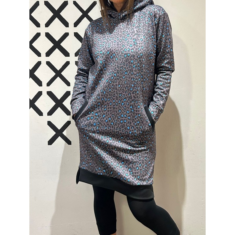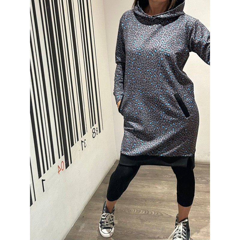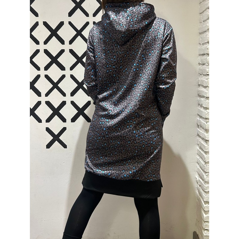 Con capucha y bajos en negro, print en animal print fondo gris y azul cielo.